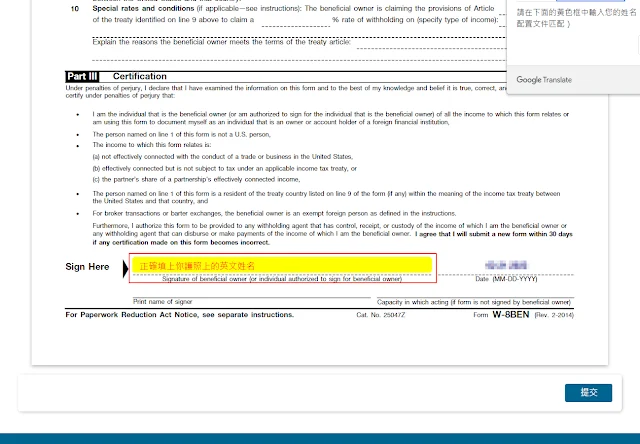 04.點按鈕打開W-8BEN 表格填入姓名 [非美國公民僅需填入姓名即可]