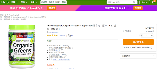 這是一款iherb上口碑極佳,售價親民的有機SuperGreen售價台幣NTD$770